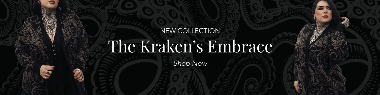 The Kraken's Embrace collection brings together some of our most striking alternative fashion pieces yet. Designed in-house and ethically made, this is gothic clothing built for real life — wearable, inclusive and unlike anything else.