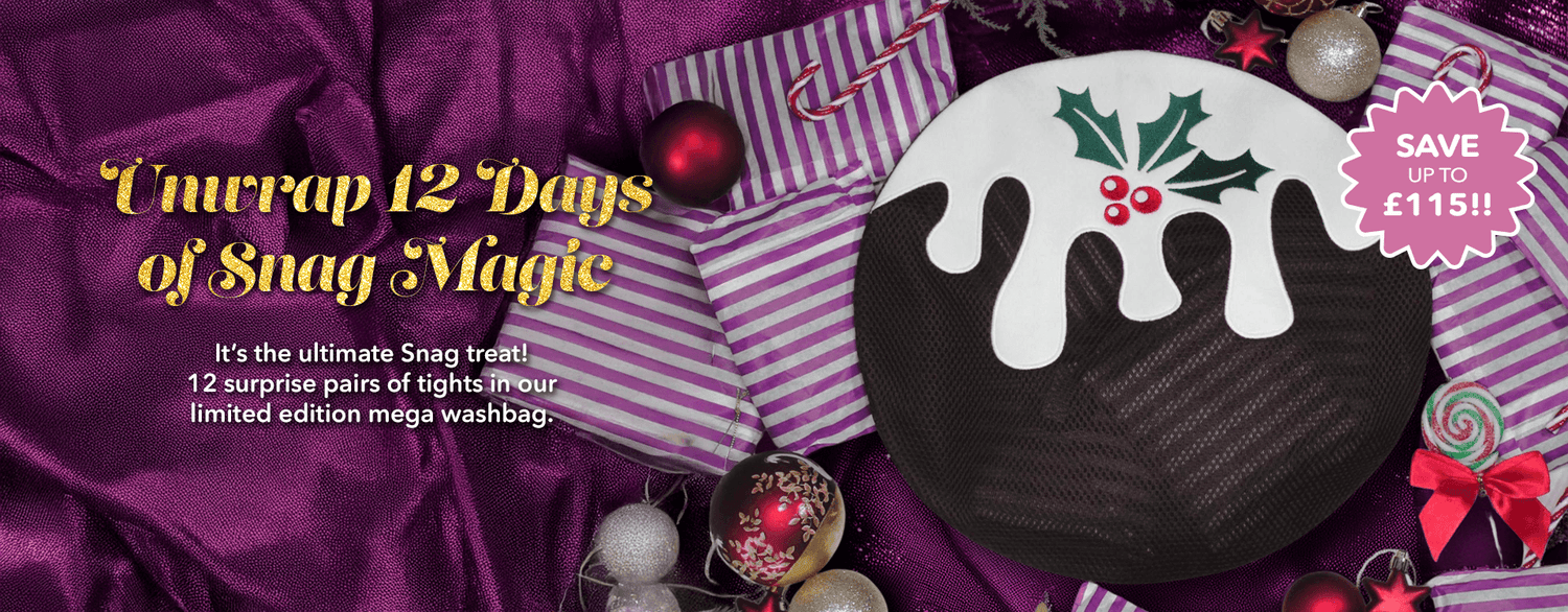 We’ve packed 12 individually wrapped mystery pairs of our super-comfy tights into a brand-new, mega-sized Christmas pudding washbag. The Snag Elves have hand-picked every pair from our previous collections, so what you get is a total surprise. Think fan-favourites, hidden gems, and must-have classics.