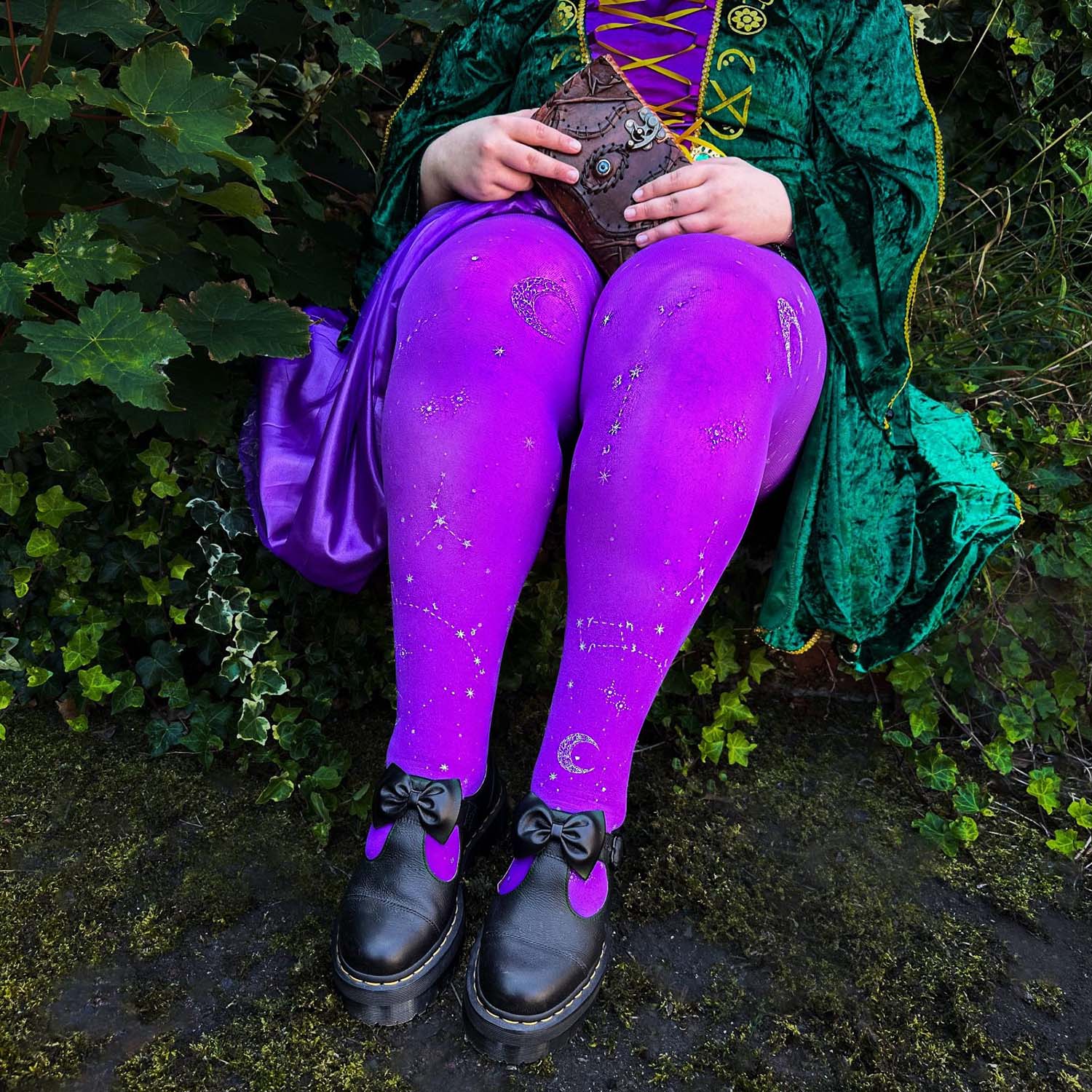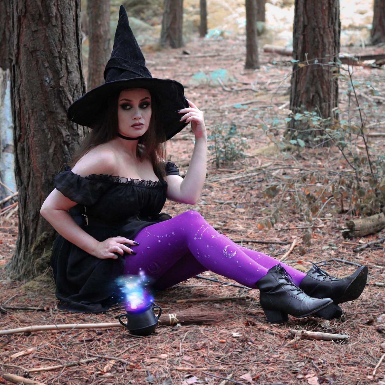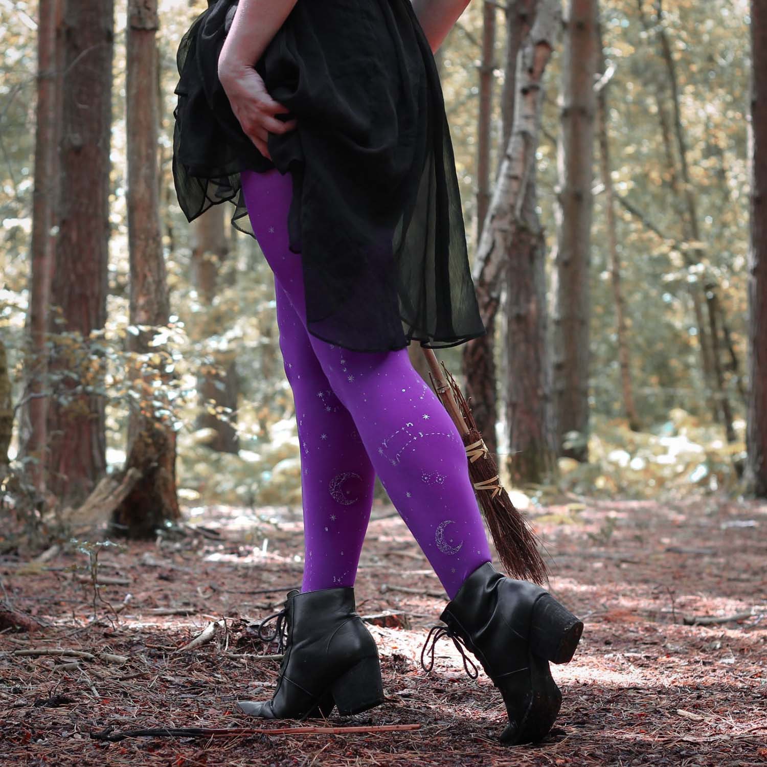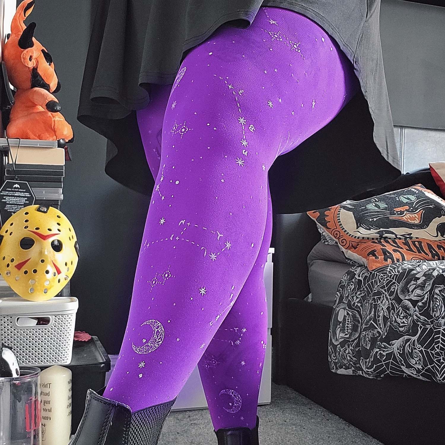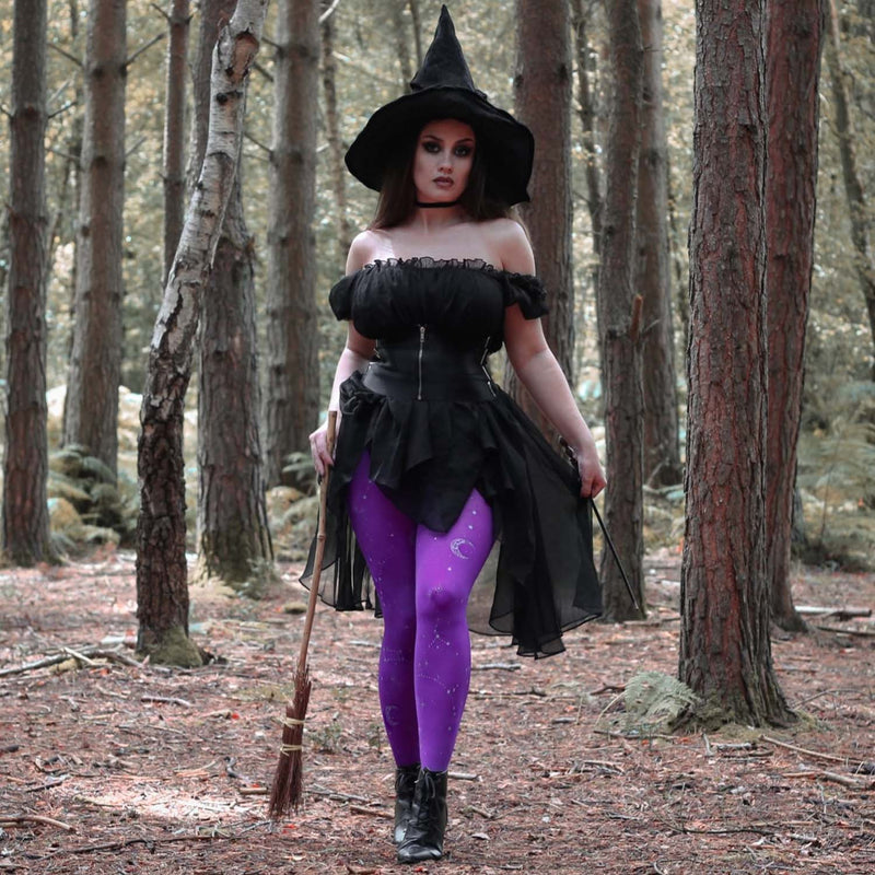 We searched where the veil is thinnest, to find Hallow-queen star and moon tights. Like a tapestry woven from the cosmos, constellations of silver glitter stars and crescent moons dance across the legs, shimmering along the purple haze base. Step into the celestial, with the perfect witchy tights that are so soft, comfortable and really fit.