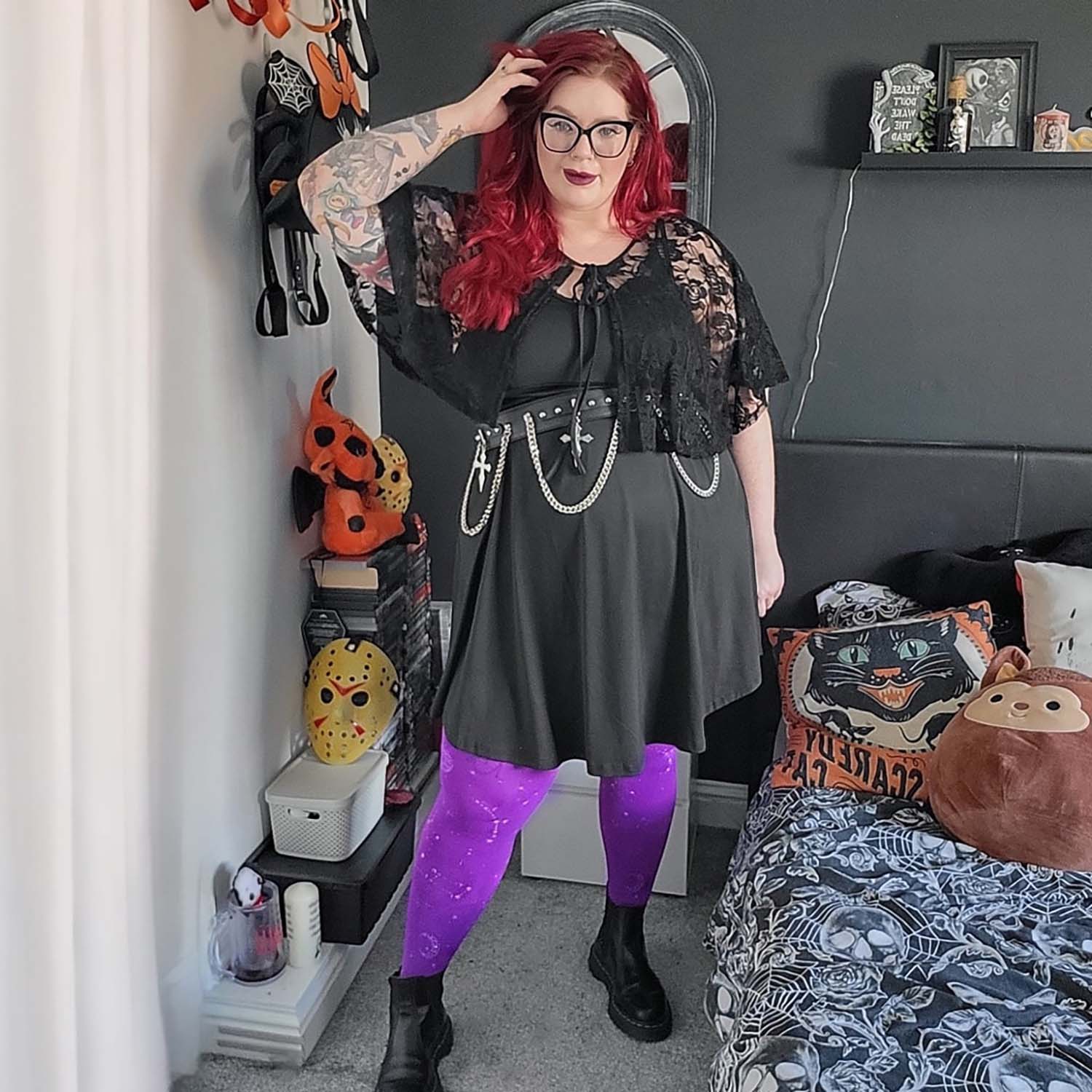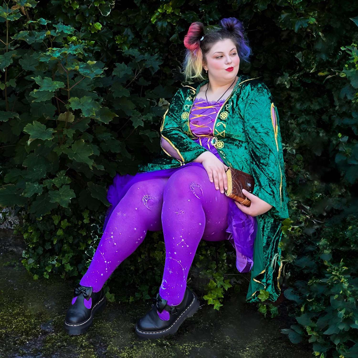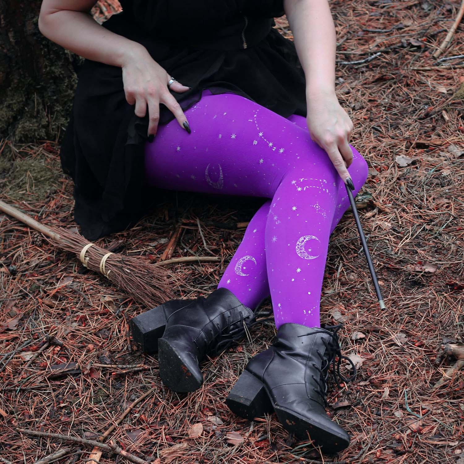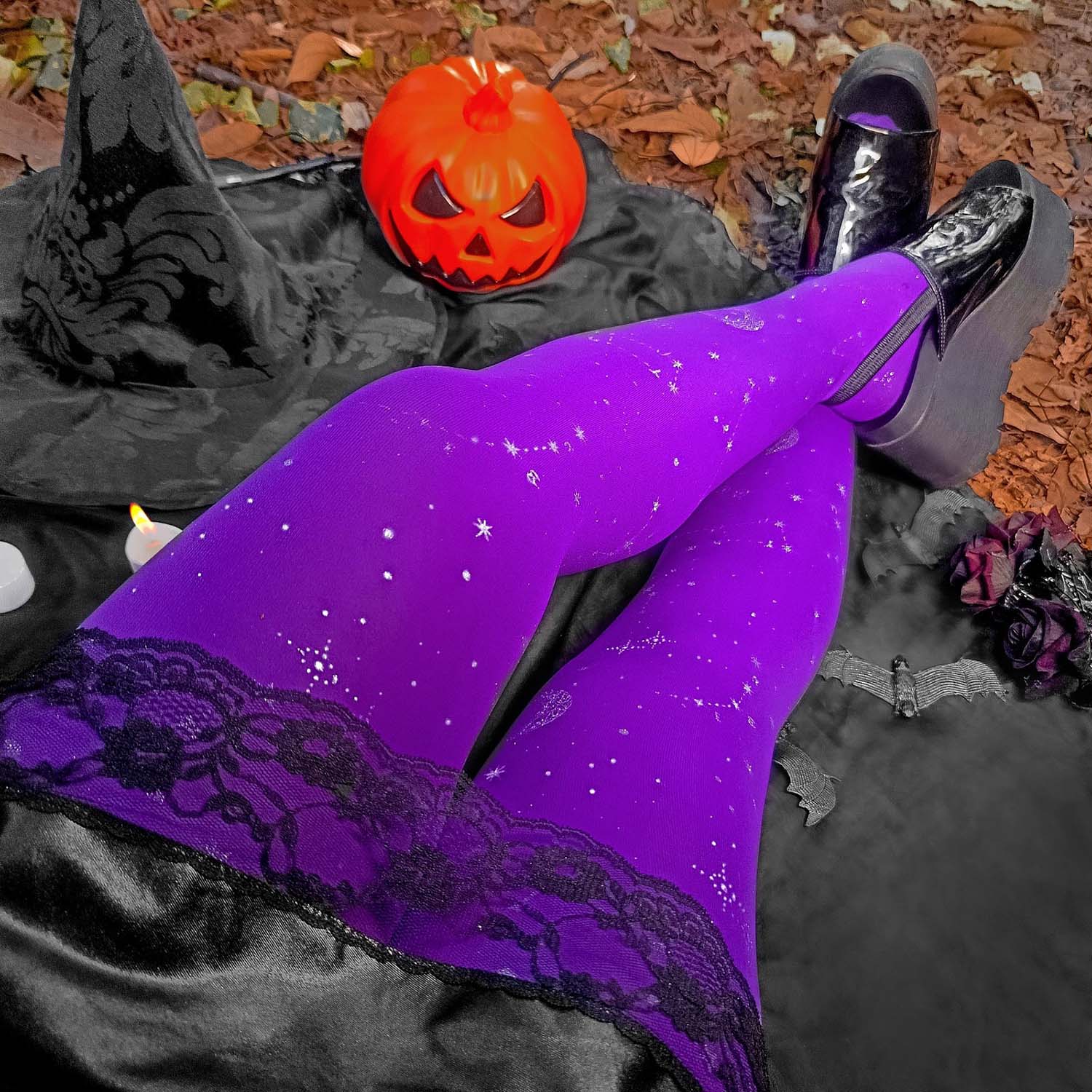 We searched where the veil is thinnest, to find Hallow-queen star and moon tights. Like a tapestry woven from the cosmos, constellations of silver glitter stars and crescent moons dance across the legs, shimmering along the purple haze base. Step into the celestial, with the perfect witchy tights that are so soft, comfortable and really fit.