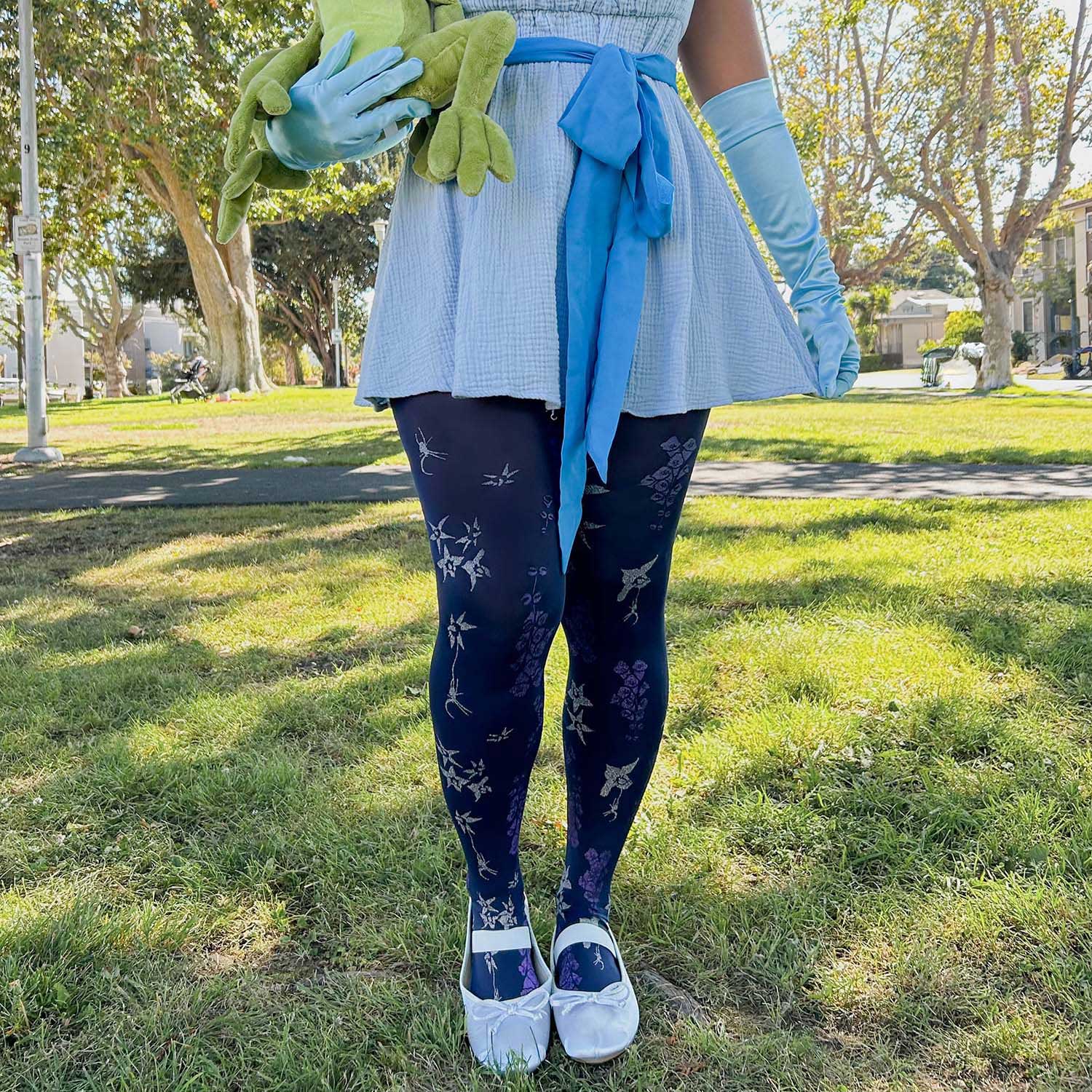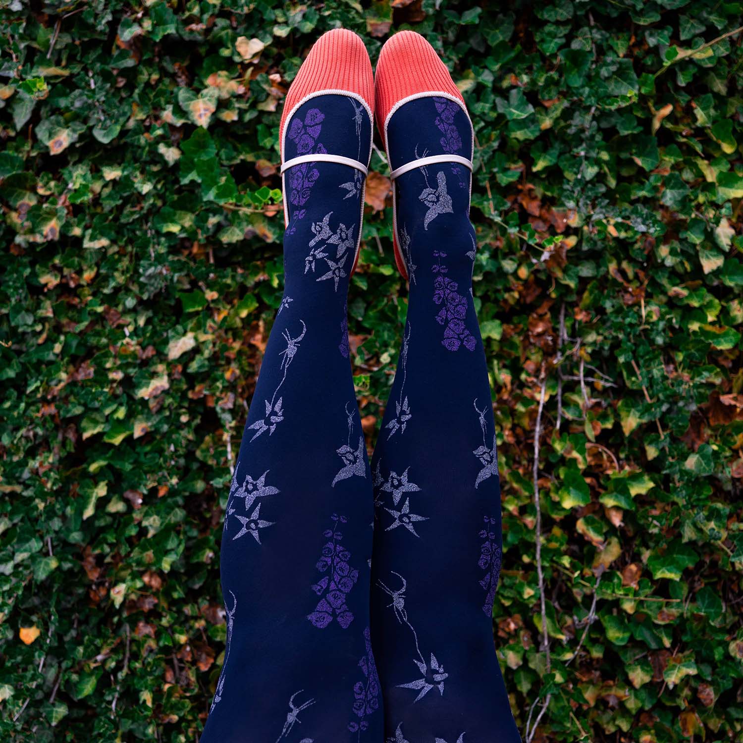 Pick your poison with Sergia tights, where danger meets beauty. These are stunning deadly plant and spider tights. Glittering black widows, deadly nightshade and foxglove bloom around the legs in silver and purple, on a deep navy base. Cute but deadly, soft but snug, this stunning design will catch the light and shimmer all year. These are THE witchy tights of the year.