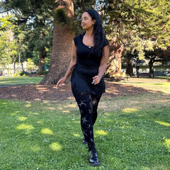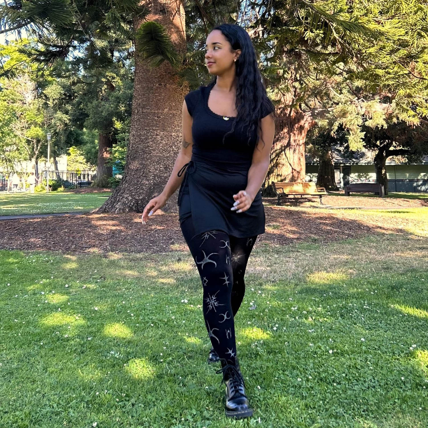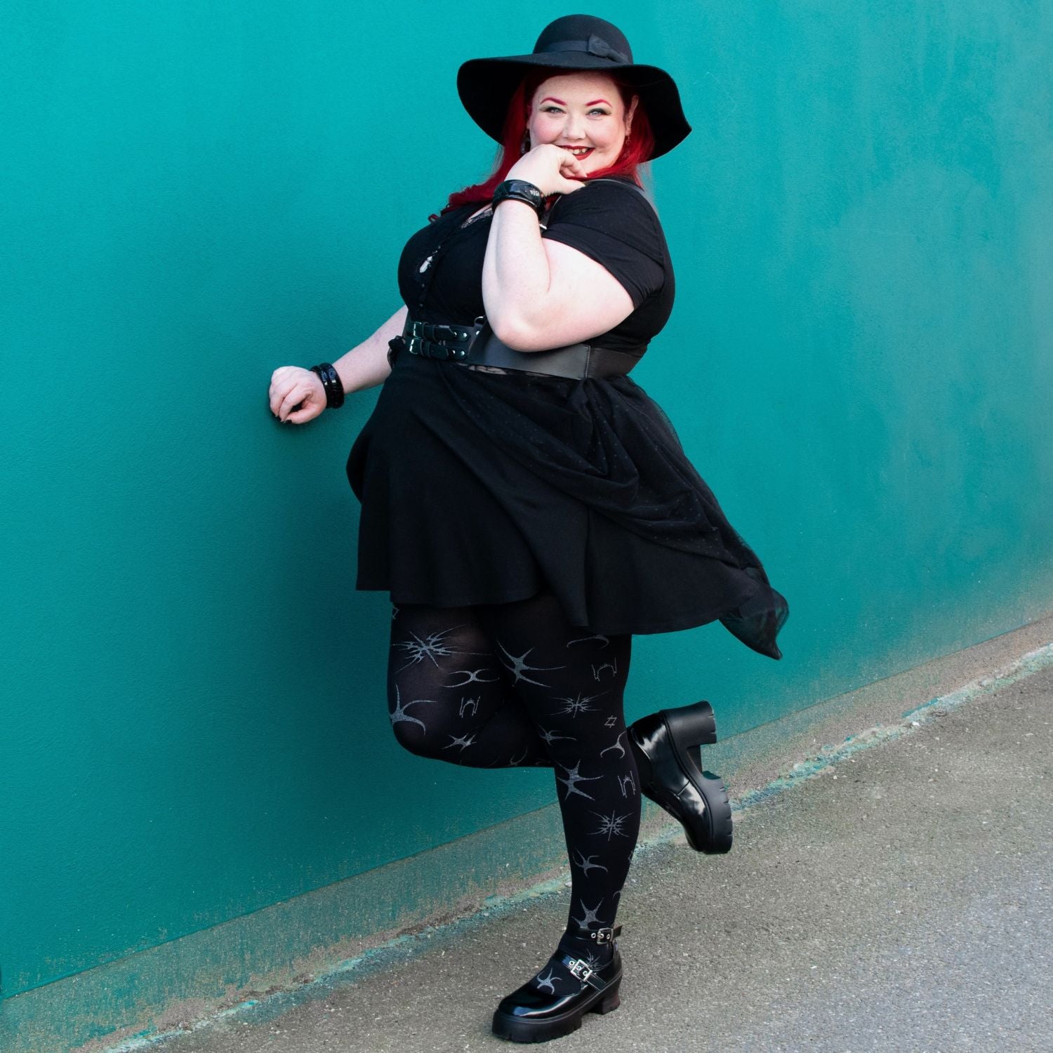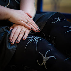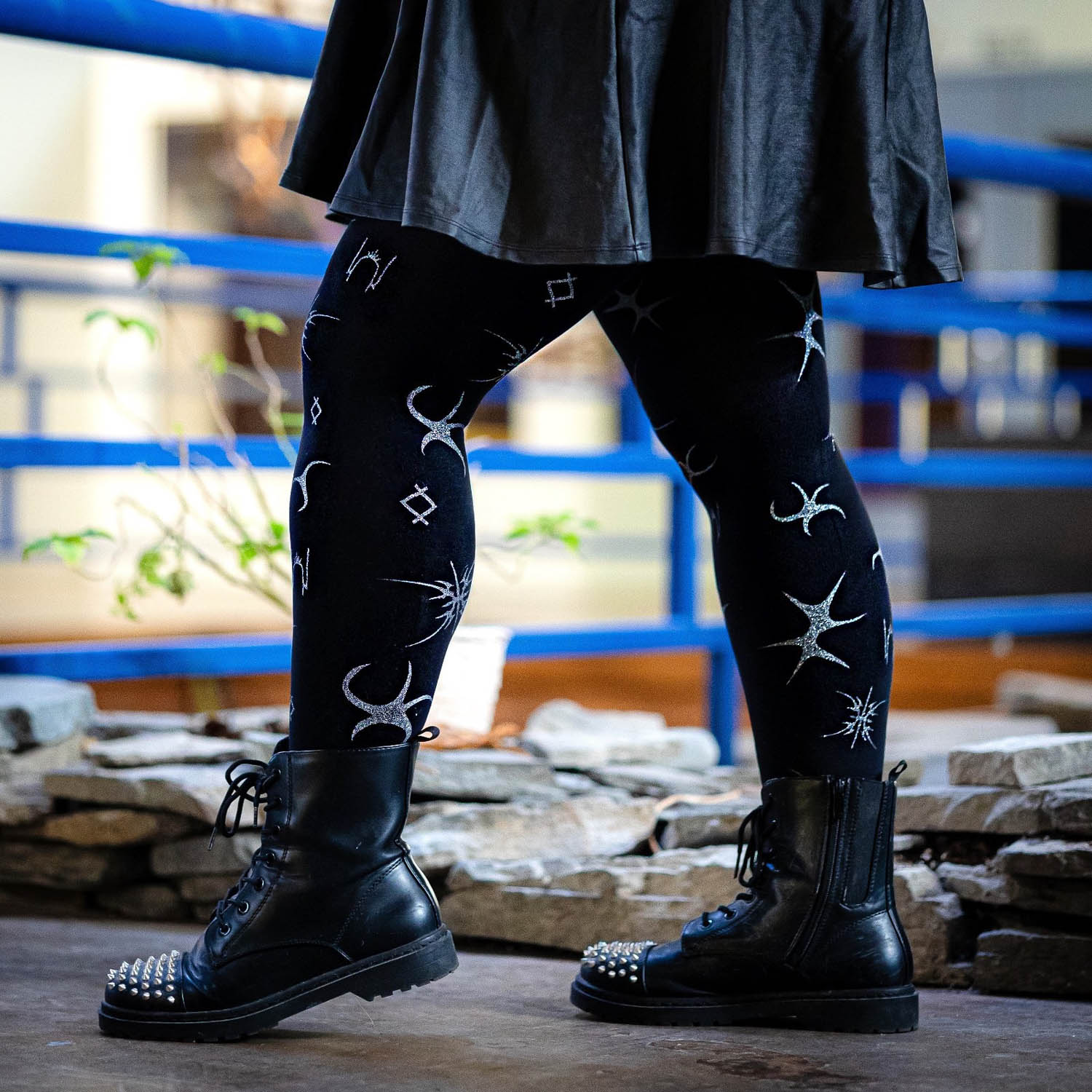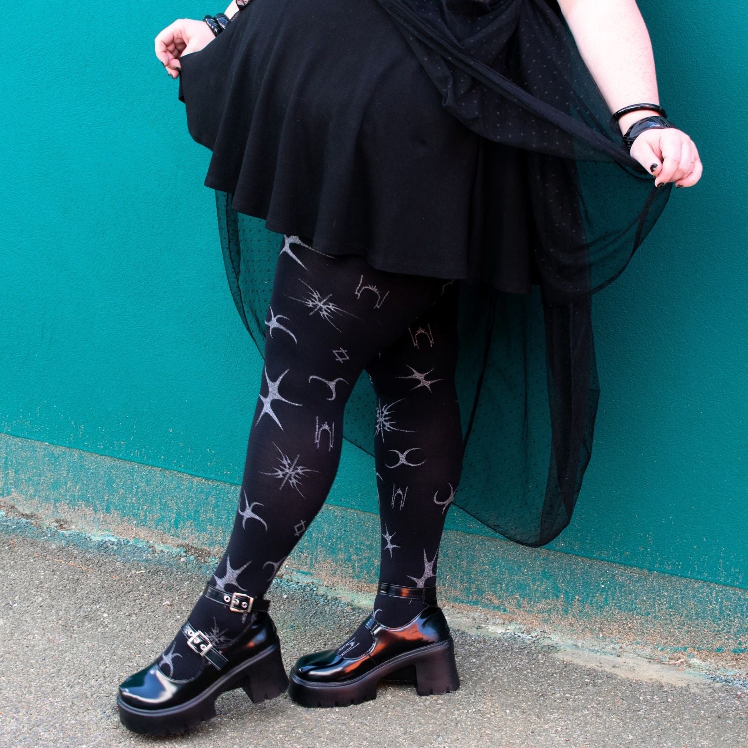 Let Silver Ink glitter tights take centre stage. These 80 denier black tights have a fierce celestial pattern, in silver glitter across the whole legs. A throwback to âNoughtiesâ festivals, it almost looks like glitter tattoos. Made to stay in place, with no rolling down, no digging in, no saggingâjust pure, unfiltered comfort.