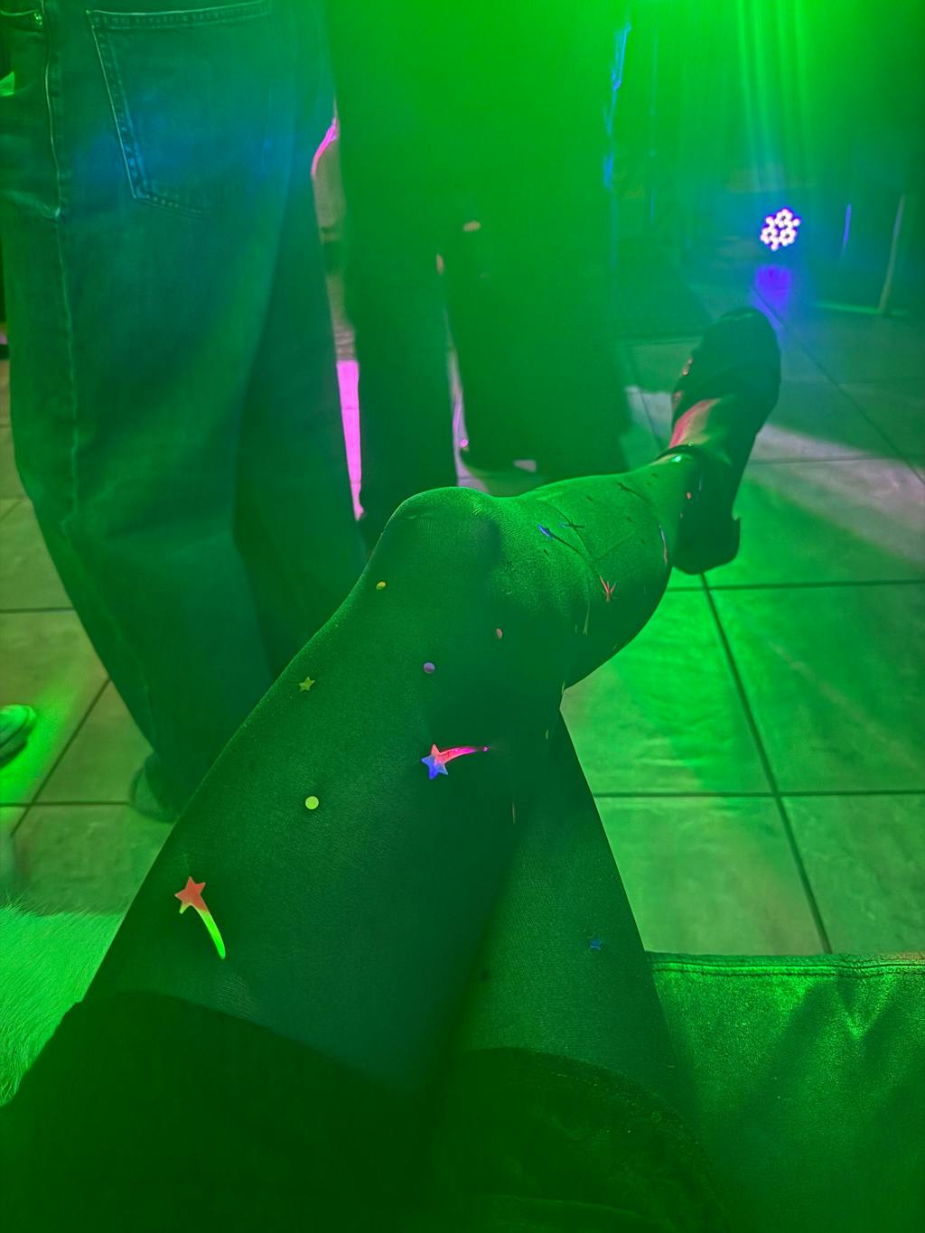 ✨ Black 80 denier base with multicoloured foil stars and comet trails