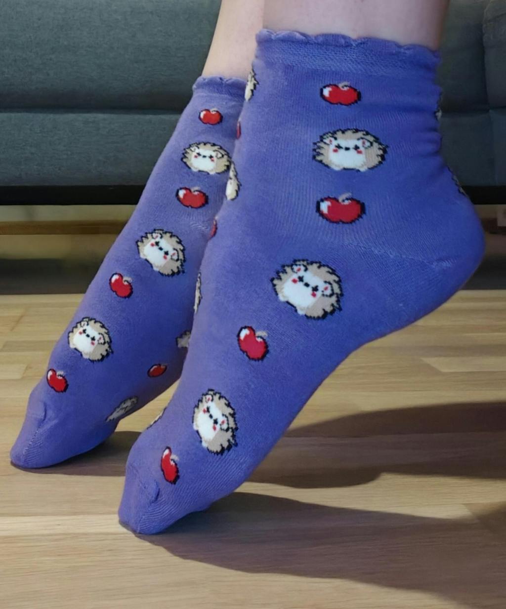 Tiny hedgehogs curled up with rosy red apples tumble across a gorgeous deep purple background, bringing just the right amount of woodland magic. Perfect for anyone who fancies the cosiest toes in the room.