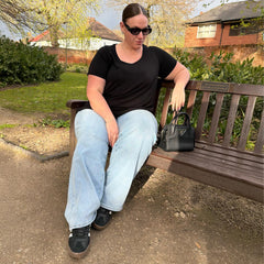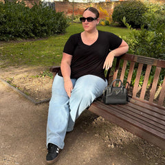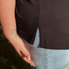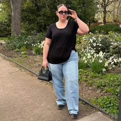 The cut is where it gets really clever. A soft scoop neckline frames your face and flatters the bust, while the fit sits neatly at the shoulders before flowing into a gentle, longline flare that skims over your tummy without clinging. It moves with you, drapes over your curves and gives you shape without ever feeling restrictive or revealing. The length hits at a bum-covering hip, making it perfect with leggings, shorts or thrown on for lounging. It’s the kind of tee you’ll reach for every day, whether you’re out and about, at home, or winding down at night.