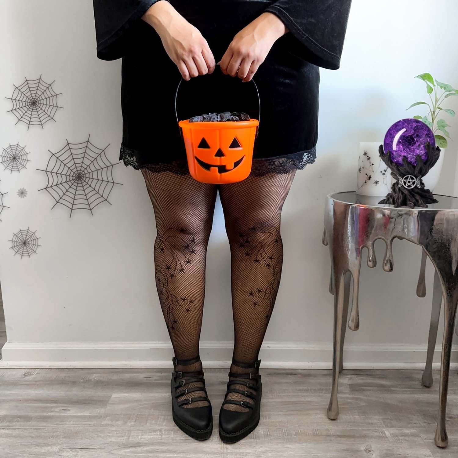 Behold Fish Upon A Star, Celestial Fishnet tights, where an intricate design of stars and swirls are knitted into yarn as dark as the night sky. It appears almost like a tattoo, as though the universe itself has marked you as its own. But these are no ordinary fishnets – they are forged from a fabric as strong and resilient as the stars, with chub rub shorts built right in, stretching with ease and oh so comfortable, while remaining steadfast against the trials of time.
