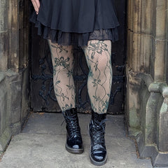 Let your legs take root in En Pointe, a deep, earthy green for our incredible Riff Raff tights. This beautiful colour brings our new pattern of swirling leaves and vines to life, woven directly into a classic fishnet base for a touch of secret garden magic.