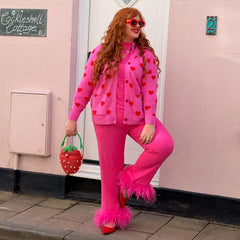Love Me, the cardigan that wears its heart everywhere. Soft pink and scattered with bold red hearts, this joyful knit is finished with matching patterned pockets and five red buttons down the pink placket. Cut to a flattering bum-covering hip length, it's designed to feel cosy, cute and confidence boosting all at once.