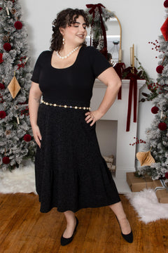 Swish onto the dancefloor with the Black Lurex Tiered Midi Skirt, your twirl-ready festive favourite. Jet-black lurex sparkles on the outer surface like midnight under fairy lights, falling in one sleek main tier before a playful lower frill kicks out for movement and fun. The frill dips lower at the back to elongate legs and frame every step in effortless glamour.