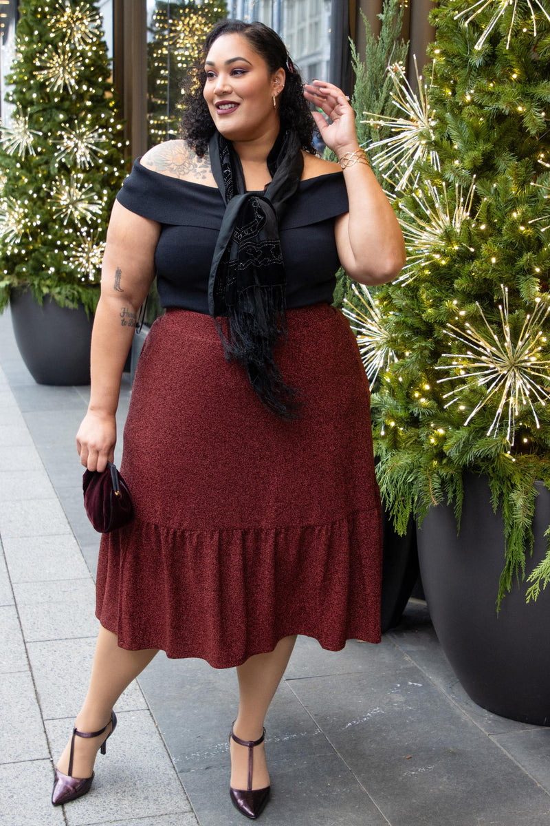 Swish onto the dancefloor with the Bordeaux Lurex Tiered Midi Skirt, your twirl-ready festive favourite. Deep burgundy lurex sparkles on the outer surface like mulled wine under fairy lights, falling in one sleek main tier before a playful lower frill kicks out for movement and fun. The frill dips lower at the back to elongate legs and frame every step in effortless glamour.