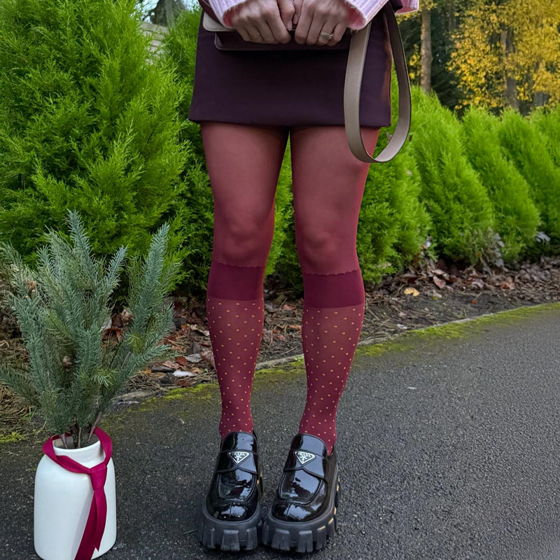 - The 'Cuff': A solid, opaque burgundy sock band sits perfectly above the dotted section, creating a striking visual break