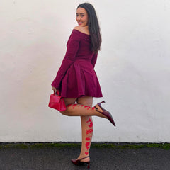 From the front, these tights look soft and barely there. From the back, they tell a whole story. The contrast between the sheer base and the richer denier red print creates a gorgeous leg lengthening effect that feels elegant but never boring. Perfect for slow turns, confident strides and that moment when someone says “wait… your tights!”