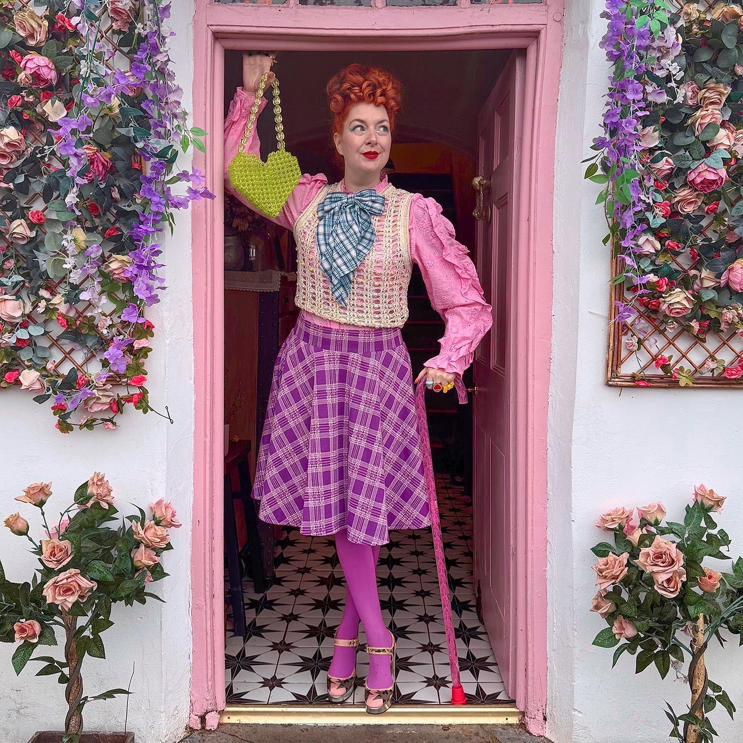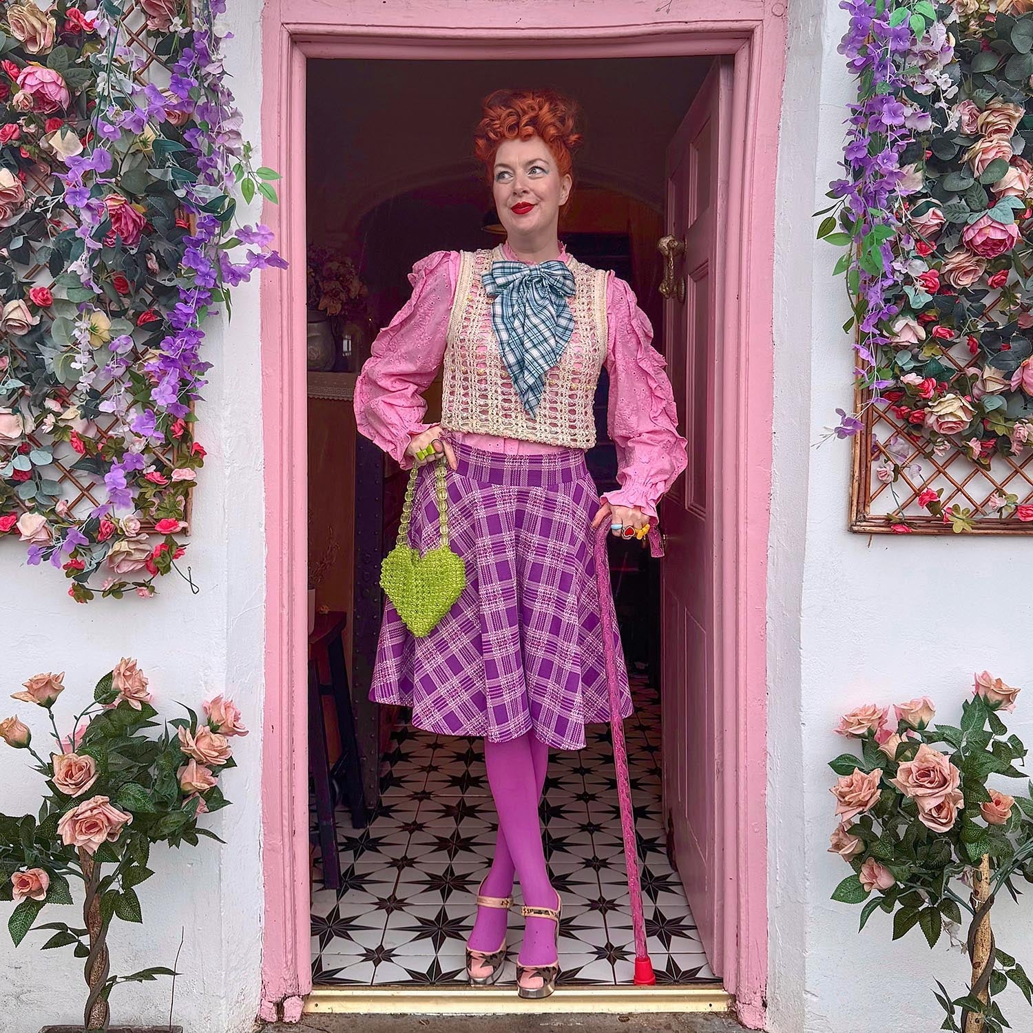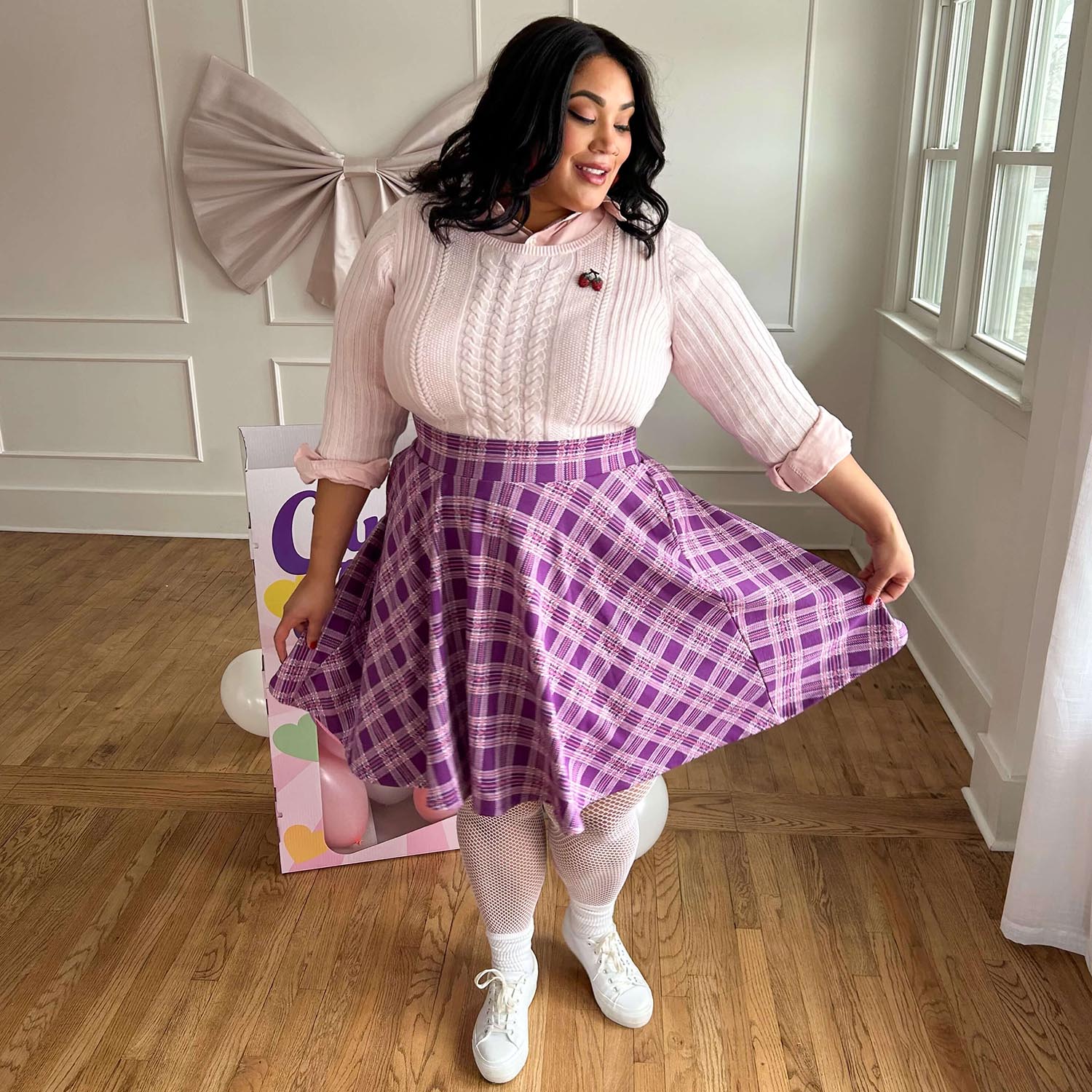 Meet the cutest Plaid Flare Skirt in Thistle. A purple base with pink and white stripes, this skirt is so comfy, stretchy, and thoughtfully designed, it’s the ultimate blend of comfort and functionality. With deep, usable pockets big enough for your phone and keys, a high-waisted and thick supportive waistband that won't ride up or roll down, and a slightly longer back to accommodate bums.