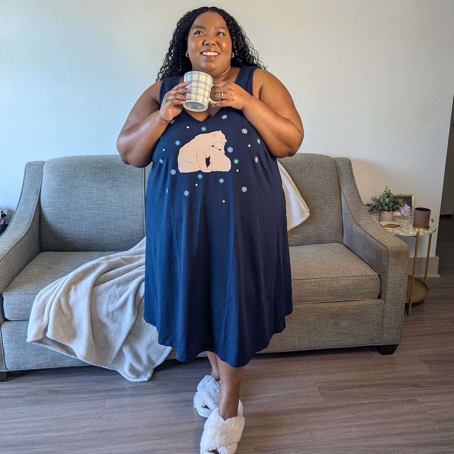 A sleeveless nighty with V-neck, bust darts for a gentle shape, side slip pockets, and a shorter length that sits just above the knee, it’s perfect for cosy nights in or chilly mornings with a warm cup of cocoa.