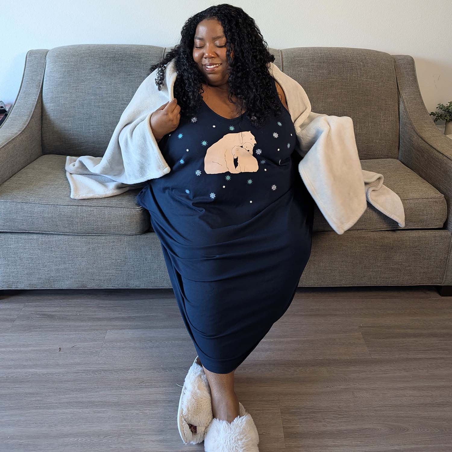 Snuggle up with frosty friends in the super comfy short night dress! The adorable polar bear and snowflake print is on a navy blue base. Made from 95% organic cotton with a hint of elastane, this night dress is soft, breathable, and comfortable.
