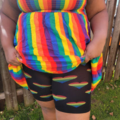 Love is in the air, and on our Chub Rubs! Featuring a beautiful rainbow heart design on a black base, Love is Love Chub Rub shorts are perfect for adding a touch of pride to any outfit. The pattern is knitted, not printed, meaning it won't stretch out or warp, keeping the design intact no matter the size. Made with special yarn that helps you keep cool in the heat, the breathable fabric quickly transfers body heat to maintain a comfortable temperature, no matter how hot it gets outside.